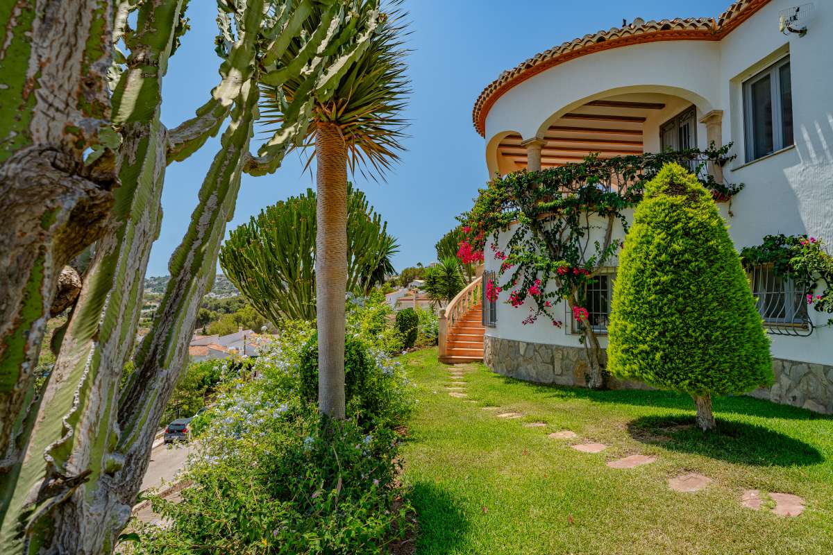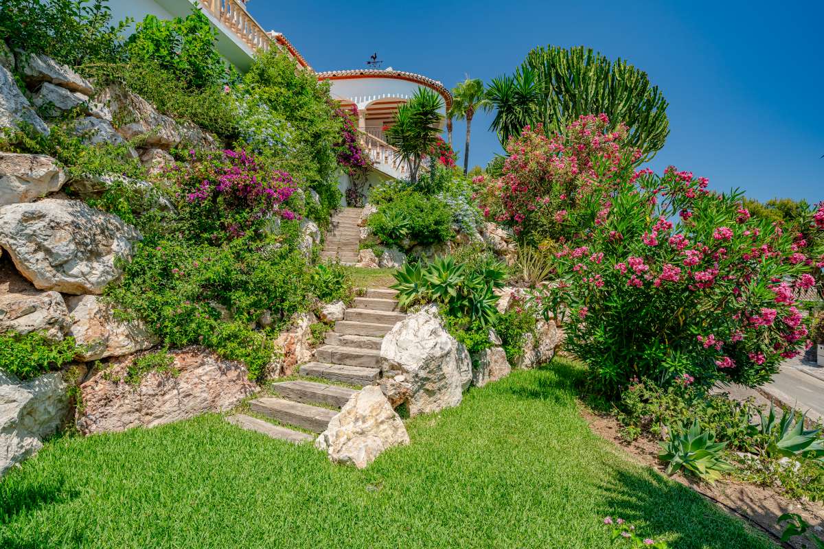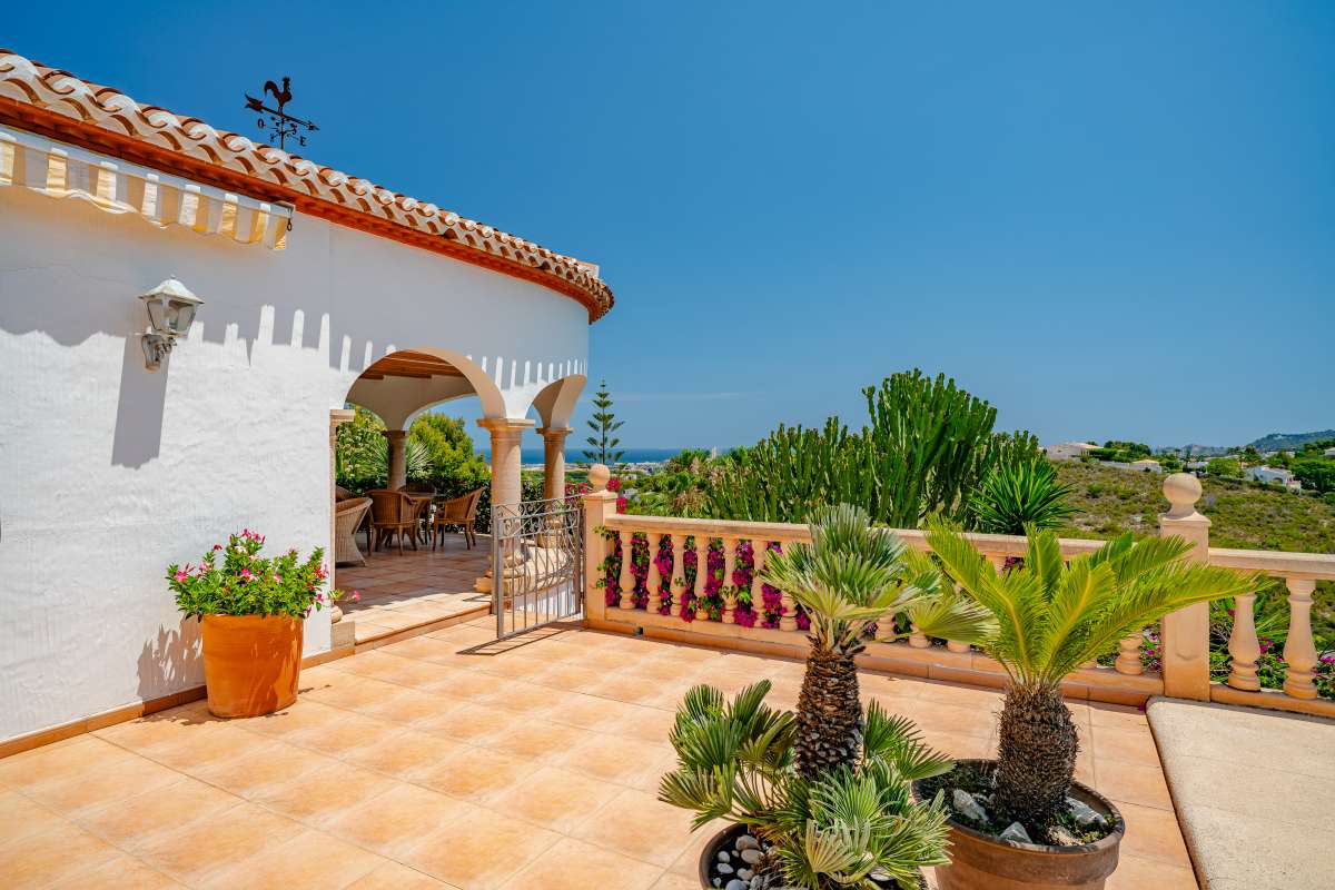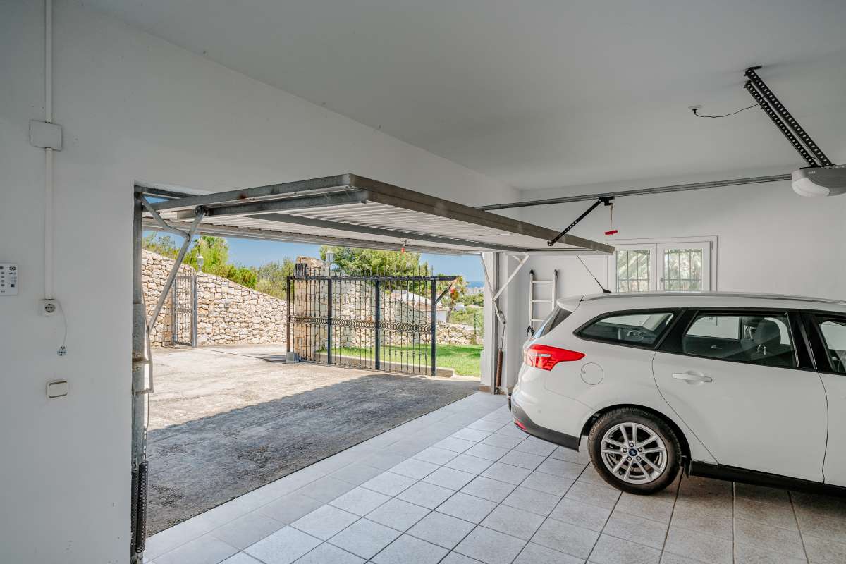 We offer you EXCLUSIVELY a unique oasis just 2.5 km from the beach: double plot, sea views and access without stairs Tucked away in a quiet cul-de-sac in one of Jávea's most desirable residential areas, this exceptional villa offers privacy, panoramic views, and a rare level of comfort with step-free access throughout, all just 2.5 km from the vibrant Arenal beach. What really makes this property stand out: 1,674m² double plot, beautifully landscaped with lush Mediterranean gardens and low-consumption irrigation. The constructed area is approximately 300 m², offering generous interior spaces spread over three levels. Step-free access to all levels, although the plot has a gentle slope, a rare and valuable feature. Uninterrupted views of the protected green areas, the Bay of Jávea and the Mediterranean Sea. 4 spacious double bedrooms and 4 bathrooms, cleverly distributed over three levels for maximum comfort and privacy. Separate guest studio with en-suite bathroom, ideal for guests or use as a home office. Open-plan main living area connected to a cozy sitting area and a charming interior patio perfect for sheltered al fresco dining even on windy days. Large covered terrace with lounge area and round dining table for eight, surrounded by flowering bougainvillea and leading directly to the pool area. Swimming pool with Roman steps, fully equipped covered summer kitchen with shower, and large flat lawns with sun loungers and private corners. Large double garage, ample parking, and a second, step-free upper access to the property, offering uncommon flexibility and ease of movement. The house features classic Mediterranean architecture, is impeccably maintained, and has a solid structure. The garden has been carefully designed, combining natural beauty with low maintenance. Unless you're specifically looking for a modern cube villa, this home offers everything you need to enjoy the Mediterranean lifestyle in one of the most prime locations on the Costa Blanca.
