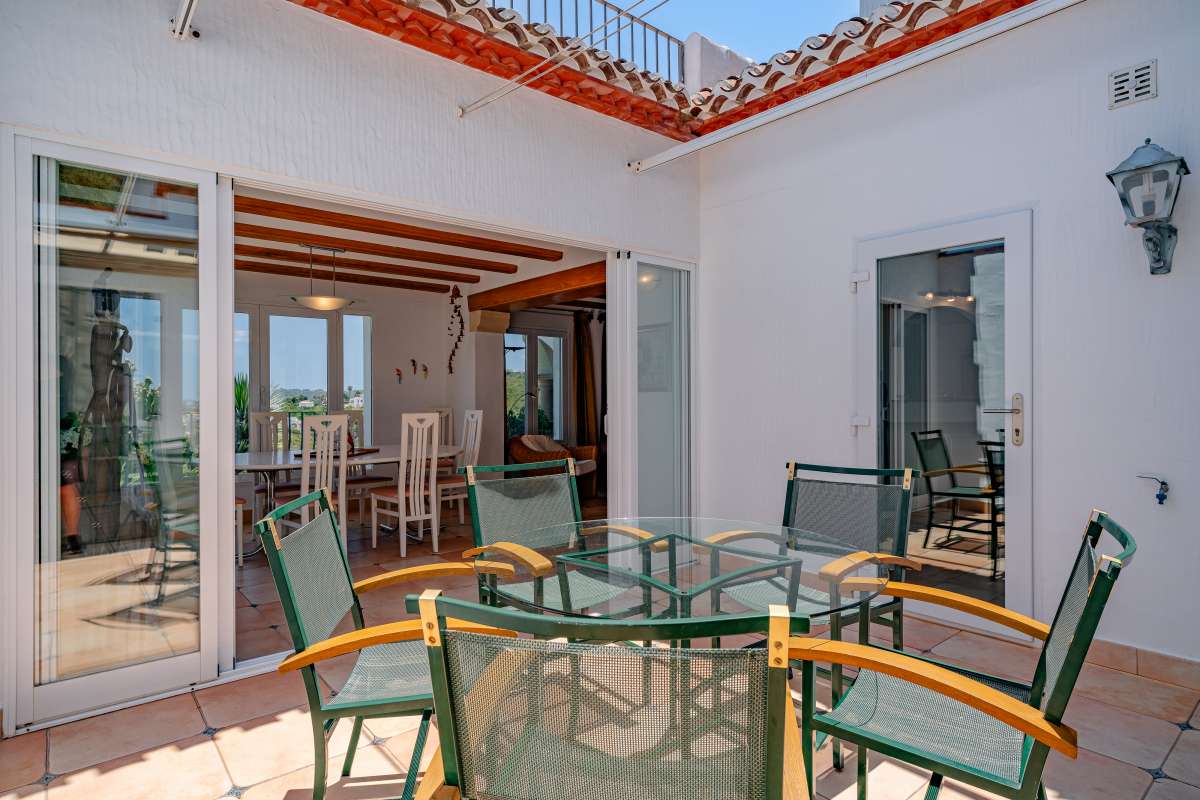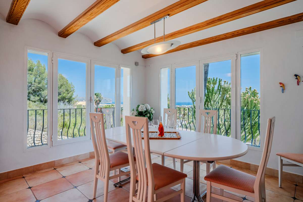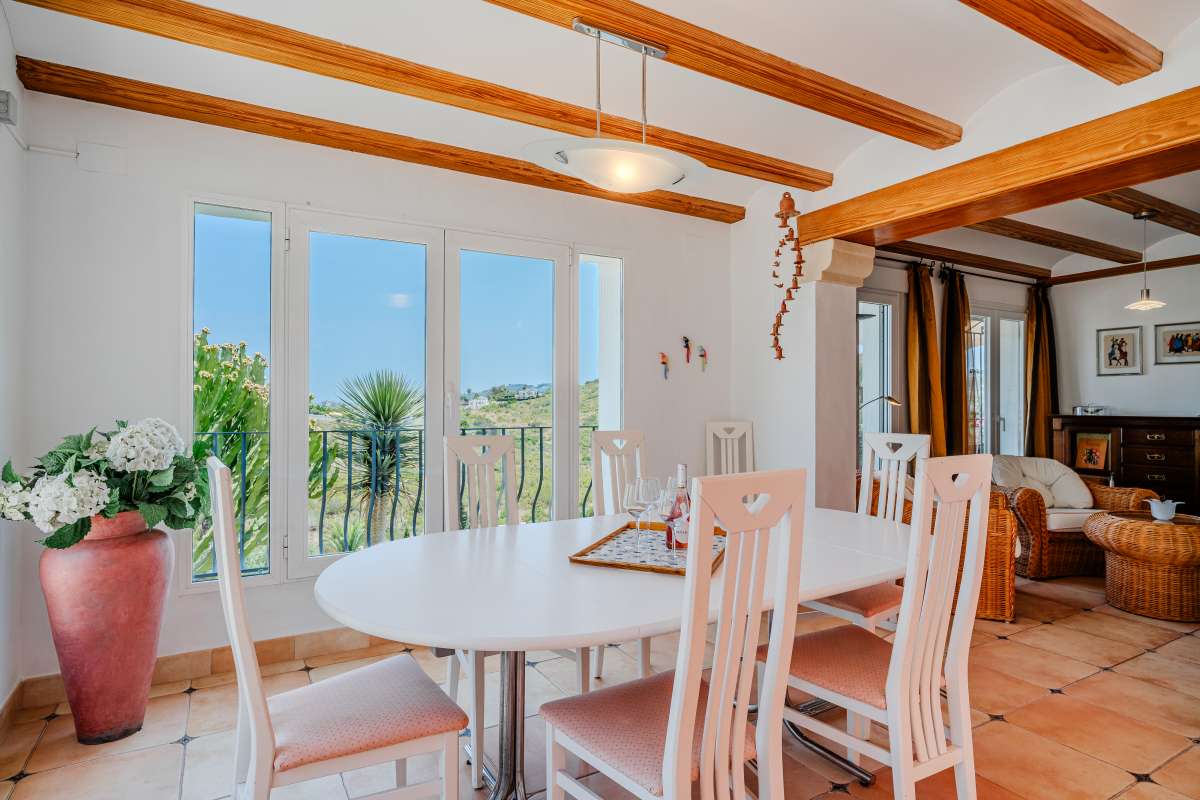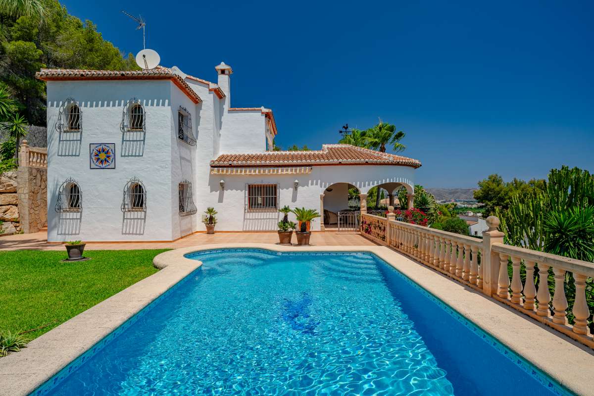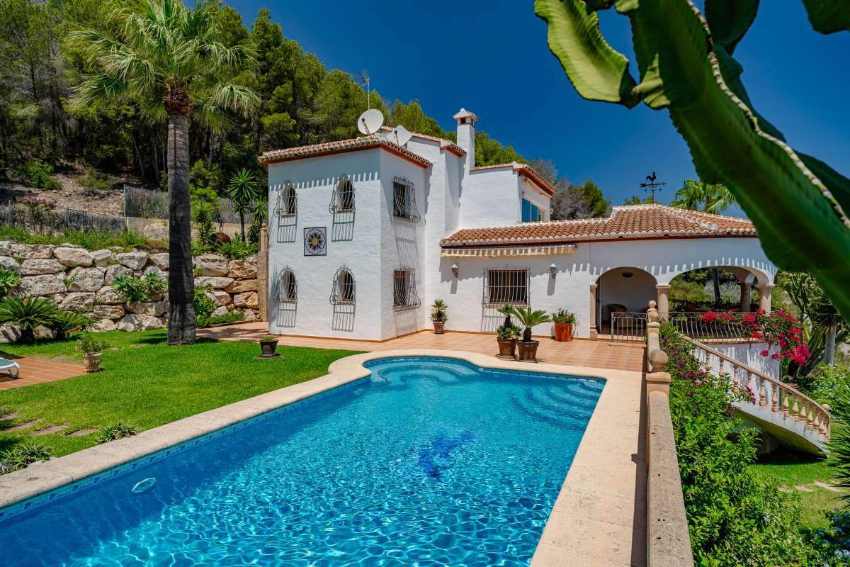 We offer you EXCLUSIVELY a unique oasis just 2.5 km from the beach: double plot, sea views and access without stairs Tucked away in a quiet cul-de-sac in one of Jávea's most desirable residential areas, this exceptional villa offers privacy, panoramic views, and a rare level of comfort with step-free access throughout, all just 2.5 km from the vibrant Arenal beach. What really makes this property stand out: 1,674m² double plot, beautifully landscaped with lush Mediterranean gardens and low-consumption irrigation. The constructed area is approximately 300 m², offering generous interior spaces spread over three levels. Step-free access to all levels, although the plot has a gentle slope, a rare and valuable feature. Uninterrupted views of the protected green areas, the Bay of Jávea and the Mediterranean Sea. 4 spacious double bedrooms and 4 bathrooms, cleverly distributed over three levels for maximum comfort and privacy. Separate guest studio with en-suite bathroom, ideal for guests or use as a home office. Open-plan main living area connected to a cozy sitting area and a charming interior patio perfect for sheltered al fresco dining even on windy days. Large covered terrace with lounge area and round dining table for eight, surrounded by flowering bougainvillea and leading directly to the pool area. Swimming pool with Roman steps, fully equipped covered summer kitchen with shower, and large flat lawns with sun loungers and private corners. Large double garage, ample parking, and a second, step-free upper access to the property, offering uncommon flexibility and ease of movement. The house features classic Mediterranean architecture, is impeccably maintained, and has a solid structure. The garden has been carefully designed, combining natural beauty with low maintenance. Unless you're specifically looking for a modern cube villa, this home offers everything you need to enjoy the Mediterranean lifestyle in one of the most prime locations on the Costa Blanca.