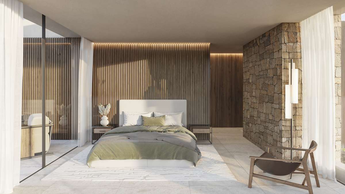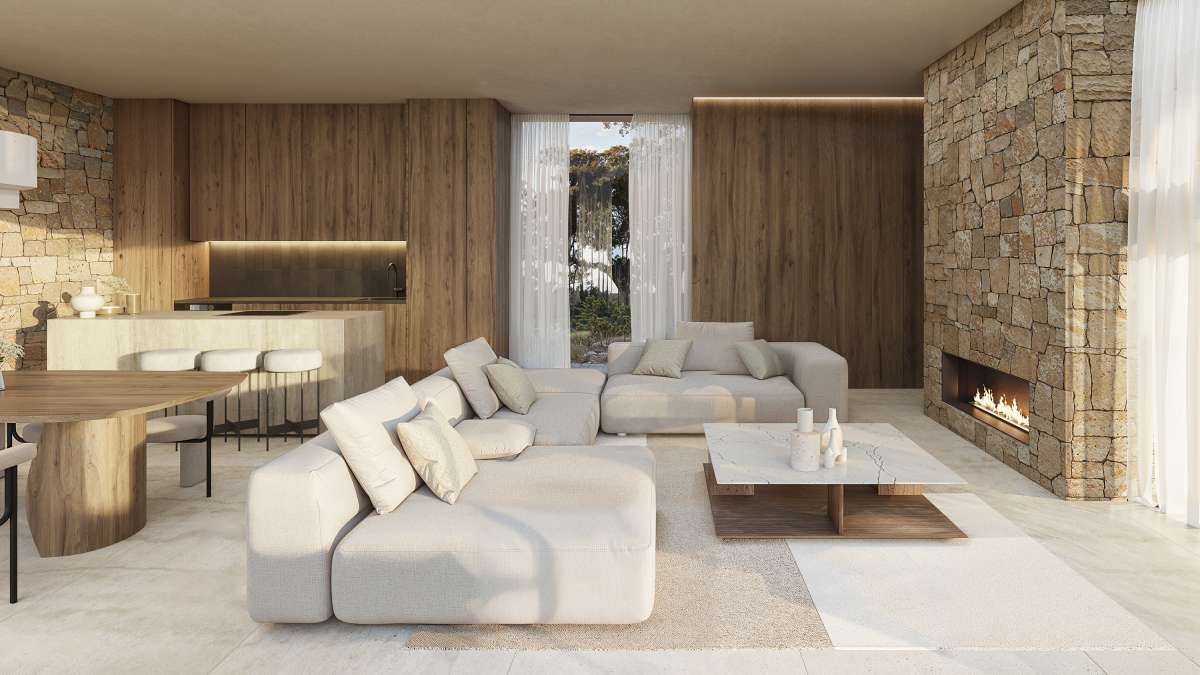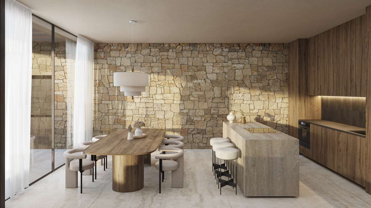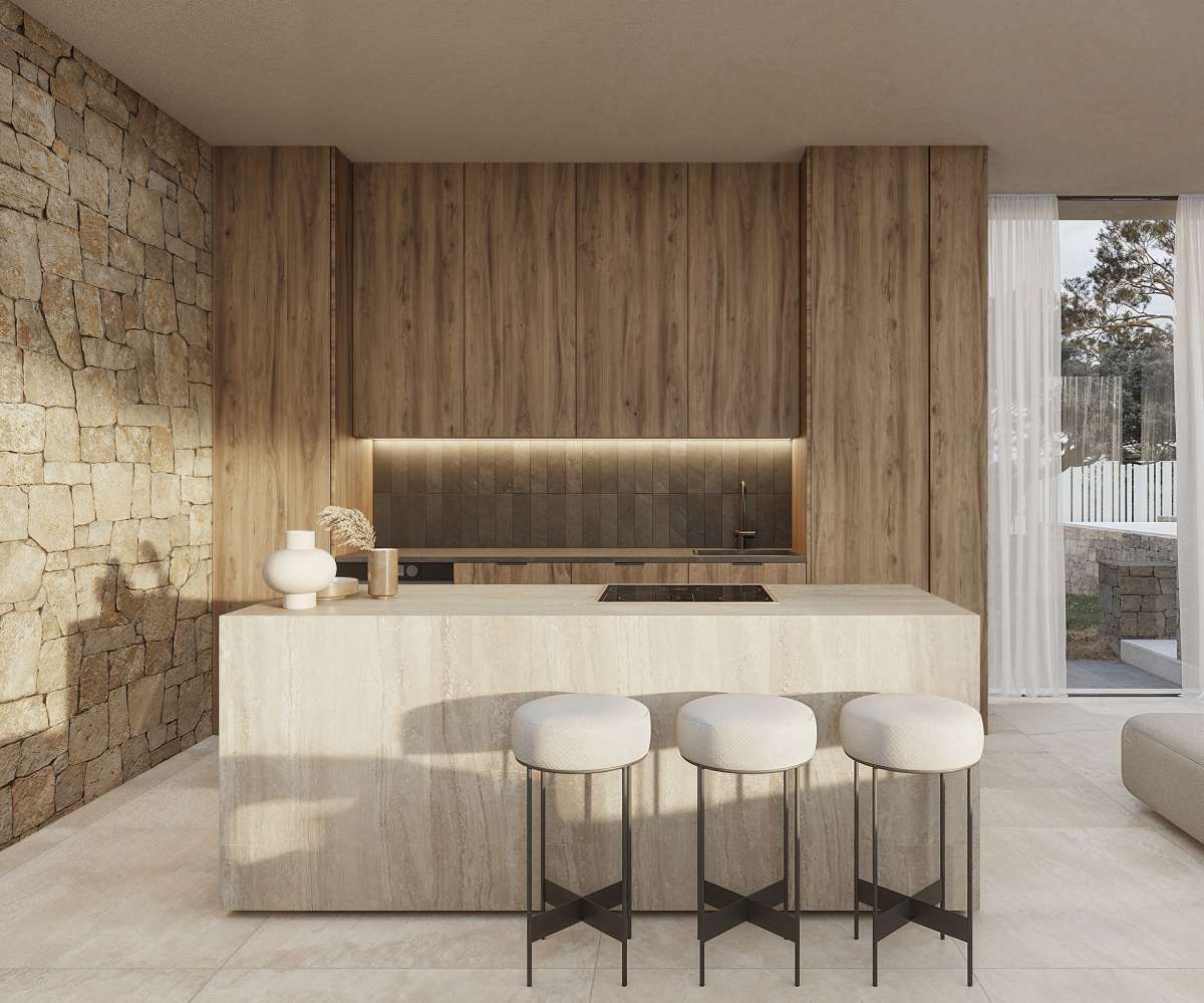 Designed by Pepe Giner Arquitectos this villa combines Mediterranean warmth with a refined modern aesthetic, blending natural stone, wood, and soft neutral tones to create a timeless architectural expression that merges seamlessly with the surrounding landscape. The villa extends over three levels and has a total built area of 716 m², distributed as follows: Inside areas: 342 m² Outside areas: 374 m² The main living level features a bright, open-plan layout with large floor-to-ceiling windows that frame the spectacular sea views and fill the interior with natural light. The living room, dining area, and kitchen connect directly to the expansive terrace, pool, and outdoor lounge area, creating a perfect indoor-outdoor flow for Mediterranean living. The villa offers four spacious bedrooms and three bathrooms plus a guest toilet, including a master suite with a private terrace and panoramic views of the sea. The interiors reflect a sophisticated balance between contemporary design and natural textures, with warm wood paneling, stone walls, and soft, neutral fabrics creating an atmosphere of comfort and understated elegance. The lower level includes practical spaces such as a gym, laundry room, and technical areas, with the possibility to customize part of the space for additional uses such as a cinema room or wine cellar. The outdoor area features a stunning infinity pool, large sun terraces, and a covered dining area under a wooden pergola, ideal for entertaining and enjoying the Mediterranean climate all year round. Located in a quiet residential street surrounded by luxury homes, this villa combines privacy, contemporary design, and proximity to the sea — an ideal choice for those seeking a stylish and functional residence on the Costa Blanca